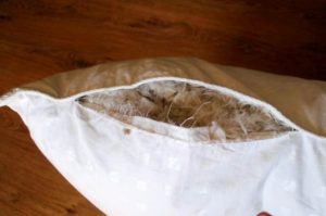 - Après cela, l'un des bords de la housse usagée est déchiré, toutes les peluches sont retirées de l'oreiller et transférées sur les nouvelles couvertures préparées, ou naperniki. Les peluches sont farcies dans une grande couverture ou disposées en plusieurs petits, les remplissant à moitié environ.