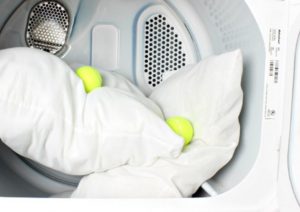 Avant de laver un oreiller en duvet dans une machine à laver, vous devez acheter des balles en plastique souple spéciales à utiliser dans les machines à laver. Avec le remplissage de l'oreiller, ces billes sont chargées dans le tambour et, pendant le processus de lavage, elles fournissent non seulement un effet mécanique supplémentaire, mais ne permettent pas non plus aux peluches de tomber en grumeaux.