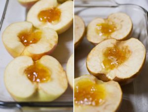 - Mélangez les noix et les fruits secs. Remplissez les pommes en tassant bien la garniture.