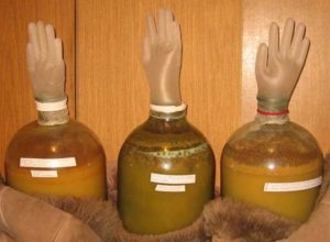- Un gant en caoutchouc avec un trou dans un doigt ou un joint étanche à l'eau est placé sur chaque pot. Ceci est nécessaire afin de limiter l'accès de l'oxygène au jus de pomme, sinon il risque simplement de devenir aigre.