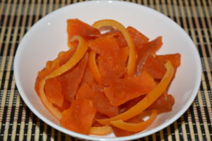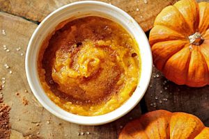 - 200 g de pulpe de citrouille râpée sont mélangés à 50 g de raisins secs cuits à la vapeur et hachés;