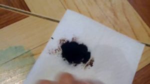 La vegetazione viene rimossa dal tappeto allo stesso modo degli altri tessuti. Dovrai usare costosi smacchiatori qui. La situazione è più complicata con i rivestimenti per pavimenti in legno: la loro struttura consente alla tintura di passare in profondità. Dovremo fare i conti con il fatto che una parte della macchia rimarrà ancora. Ma vale la pena provare a rimuovere completamente l'antisettico!