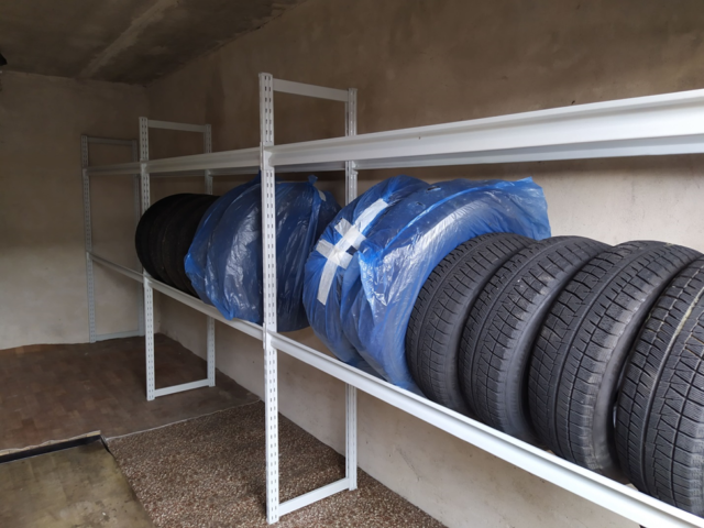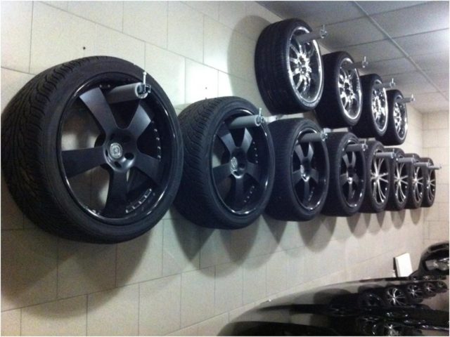 L'uso di scaffalature consente di risparmiare notevolmente spazio - Ganci... Dovrebbero essere usati per appendere la gomma. In questo caso la ruota deve essere agganciata al disco per evitare il contatto con la superficie.