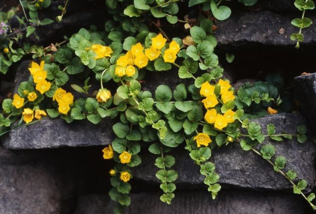 La salsiccia macchiata è popolare nel giardinaggio ornamentale - Monetario (Lysimachia nummularia). La pianta ha fusti striscianti lunghi fino a 30 cm.