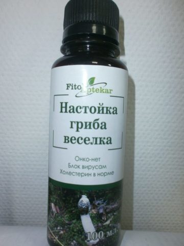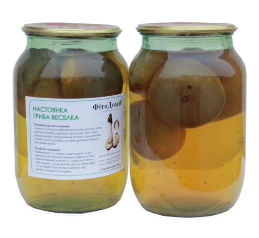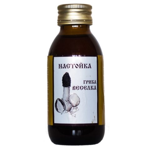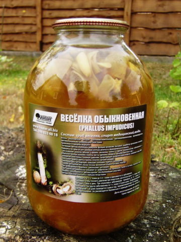 Una tintura alcolica del comune fungo veselka ha diverse opzioni di produzione e applicazione. Una vergognosa pappa (750 g) e alcol (1,5 l) vengono messi in una bottiglia. Il rimedio è insistito per quattro settimane.