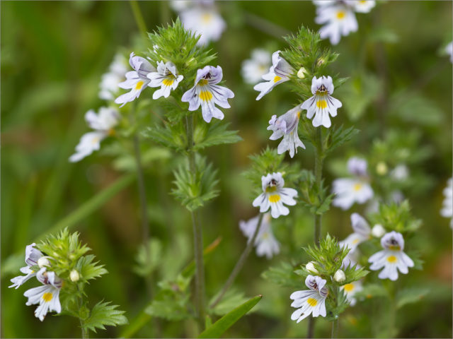 Eyebright è un'erba appartenente alla famiglia Norichnikov. Si trova spesso sui bordi delle strade, nelle torbiere, nei margini delle foreste e tra i cespugli. L'altezza del fusto della pianta può raggiungere i 50 cm La parte frondosa è ovoidale e presenta bordi appuntiti. Le infiorescenze si formano sulla sommità dello stelo. I loro petali hanno una tonalità viola pallido. Una foto dell'erba per l'occhio aiuterà a distinguerla dalle altre piante.