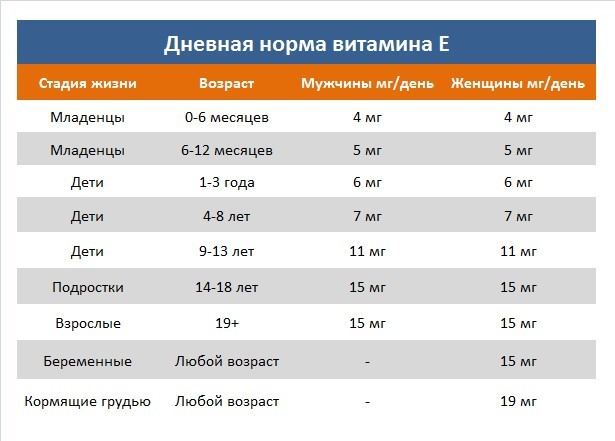 Dal momento della nascita all'età di 6 mesi, la necessità di un organismo in crescita in tocoferolo è di 2-3 mg o 3-4 UI (unità mediche) al giorno. Una dose così piccola gioca un ruolo chiave nello sviluppo e nella crescita di un bambino.