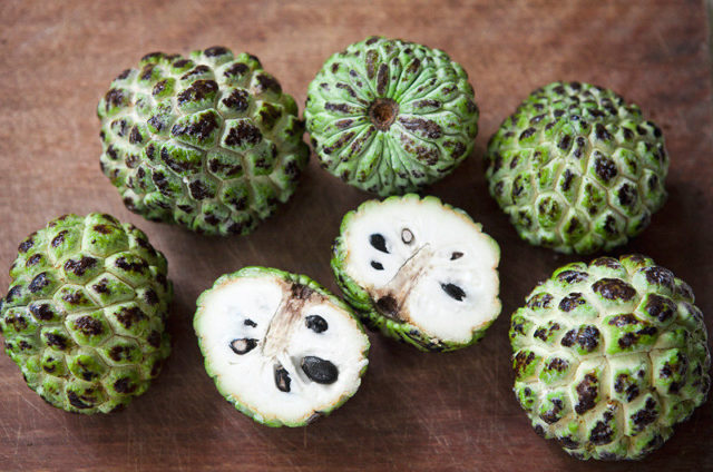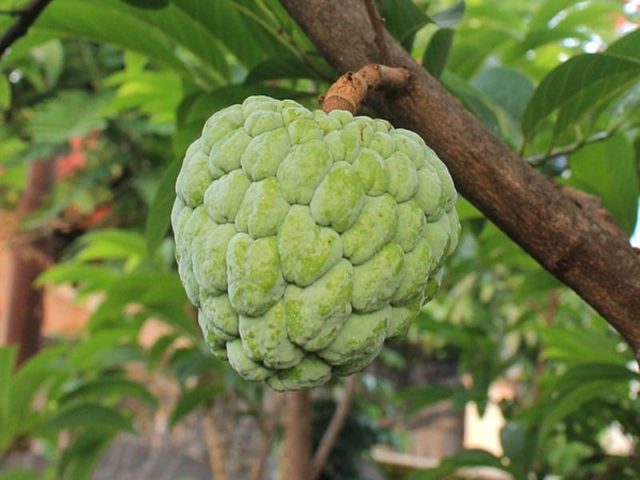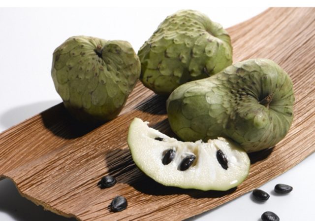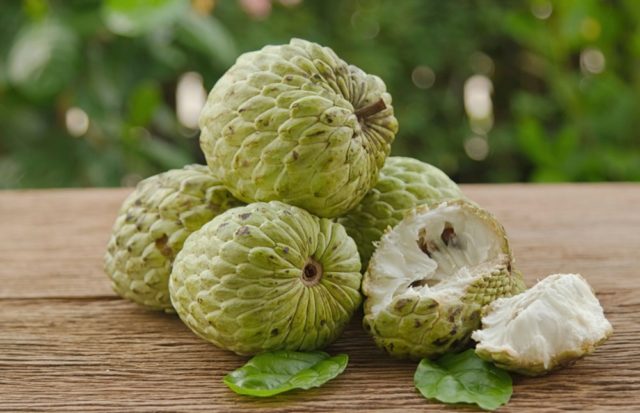 I frutti sono segmentati, ricoperti da una buccia densa, come scaglie, e all'interno del frutto c'è una polpa aromatica leggera. Ha una consistenza cremosa; 15-20 semi neri si trovano più vicino al nucleo.