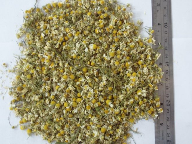 Allo stesso tempo, la camomilla deve essere spalmata sulla superficie in uno strato relativamente sottile. Per 1 mq. m area rappresenta 1 kg di materiale raccolto. Il processo di essiccazione dura circa una settimana e richiede la miscelazione quotidiana dei fiori, facendo attenzione a non far cadere i petali. La camomilla è considerata secca quando i fiori possono essere facilmente macinati in polvere. Per accelerare il processo, è consentito asciugare la camomilla in forno a bassa temperatura.