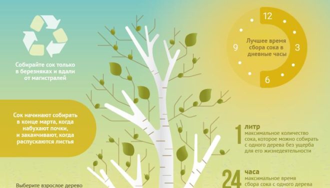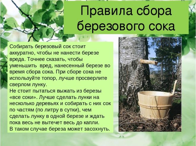 I benefici del prodotto sono direttamente correlati al rispetto delle condizioni per la raccolta e la raccolta del nettare. La linfa di betulla viene raccolta da fine marzo a inizio maggio.Per controllare il flusso di linfa, puoi perforare la corteccia con un punteruolo. Una goccia di liquido limpido che entra indica un momento adatto per la raccolta.