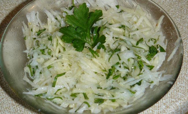 Il ravanello bianco è un ortaggio a radice che si sposa bene con qualsiasi verdura. Pertanto, è possibile preparare un'enorme varietà di insalate. È anche combinato con altri prodotti.