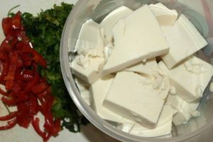 Taglia le verdure a pezzetti. Cuocere il cavolfiore a bagnomaria per 15 minuti, utilizzare i peperoni crudi. Liberare il tofu dal liquido in eccesso premendo, sbriciolare con una forchetta o tagliare con un coltello. Trita le erbe aromatiche. Mescolare tutti gli ingredienti, aggiustare di sale.