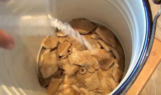 - Dopo l'ammollo, prendi un secchio grande e versaci un po 'di sale. In cima, iniziano a stendere i funghi a strati, senza dimenticare di versarli ogni 2-3 cm.