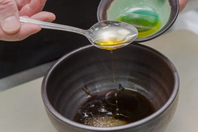 - aggiungere il miele fresco in un contenitore di vetro, 1 cucchiaio. l. peperone rosso, 2 cucchiai. l. il nostro olio sano;
