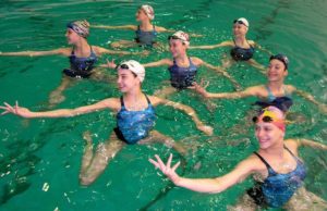 - Questo è seguito da esercizi di stretching, che vengono eseguiti anche a bordo piscina. Rilassano i muscoli e normalizzano la frequenza respiratoria. Per fare questo, le donne si siedono su uno spago nell'acqua, fanno salti verso l'alto con le gambe sollevate e squat lenti con supporto laterale.