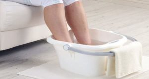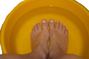 - l'acqua calda viene versata in un secchio o in un bagno, si siedono comodamente su una sedia o uno sgabello e abbassano le gambe nel liquido;
