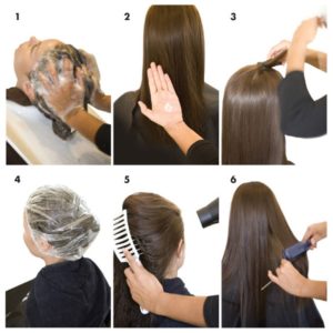 - След това косата се изплаква с топла вода, изсушава се и се прилага специална овлажняваща маска.