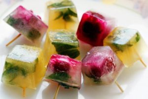 Много е полезно да избършете лицето си с кубчета лед с добавяне на различни плодове и плодове, или по-скоро сокове, изцедени от тях. Всички цитрусови плодове, ябълки, ягоди и грозде, диня и пъпеш са подходящи за създаване на такива кубчета. Например, кубчетата ягоди са полезни за фините бръчки, а кубчетата грозде имат мощни антиоксидантни свойства и се борят добре със стареенето.