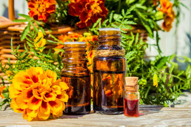 Ако е възможно, по-добре е да използвате свежи цветя за готвене. Но през зимата можете да направите маслена тинктура от изсушени суровини. Схемата за готвене не се променя. Нарязаните невенчета трябва да се изсипят в буркан и да се оставят да варят поне една седмица. Течността трябва да се разбърква периодично.