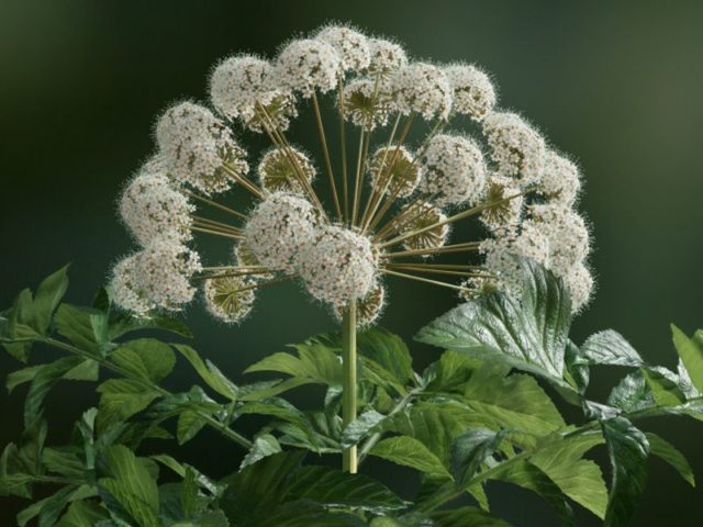 От юни до август ангеликата носи големи „чадъри“, състоящи се от малки и невзрачни поотделно пъпки. Цветовете на растението са белезникави или жълто-зелени, с почти невидими чашки. През есента на мястото на съцветия се появяват плодове - удължени продълговати кутии и от един храст могат да се съберат до 500 г семена.