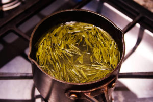 - Иглите се изсипват в емайлиран съд, изсипва се 1 литър вряща вода.