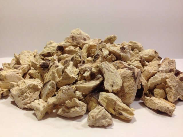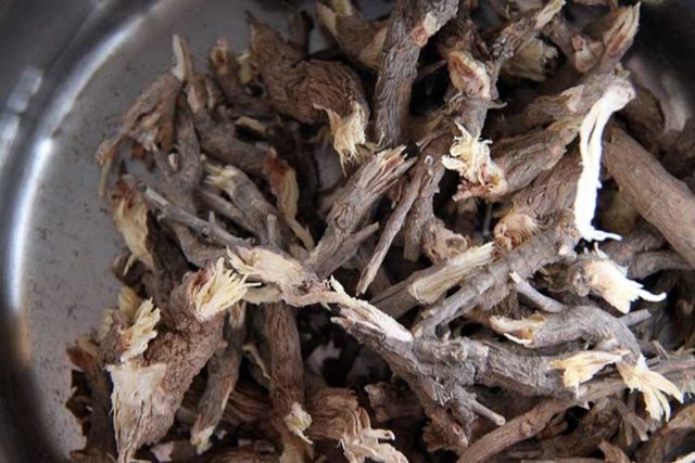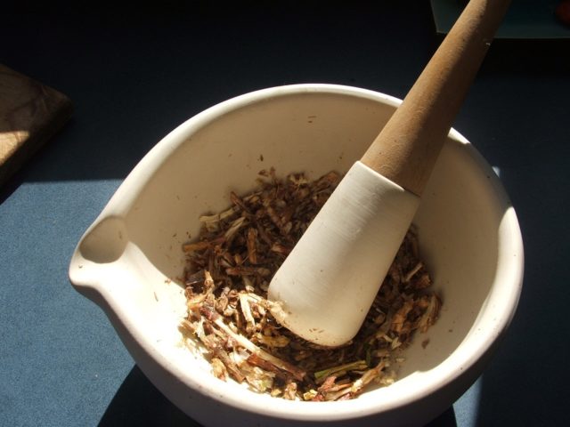 - Около 10 г сухи коренища на растението се запарват с 250 мл прясна вряща вода.