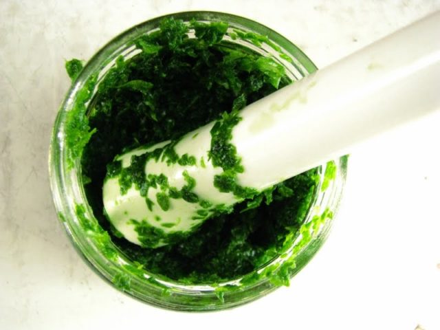 - Получената зелена маса се прилага обилно върху марлева превръзка.