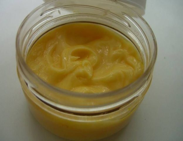 - четири големи лъжици масло от морски зърнастец се загряват и разреждат с 5 г пчелен восък;