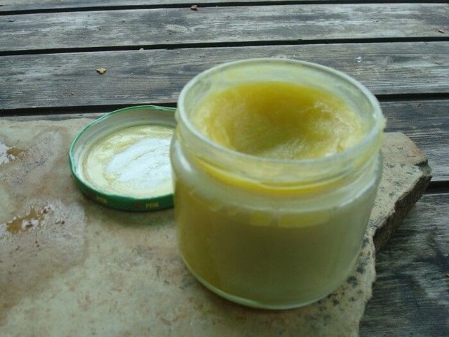 - Смесете зелената маса със зехтин и разтопен восък в съотношение 2: 1: 1.