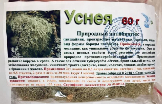 Естественият антибиотик под формата на отвари се използва при пневмония, настинки и инфекциозни процеси на горните дихателни и пикочните пътища, язви, заболявания на щитовидната жлеза. Лишейът е добро имуномодулиращо средство. Бульоните са полезни при дисбиоза, стоматит. Комбинацията с други лечебни билки позволява използването на конци като Usna за елиминиране на симптомите на бронхиална астма.