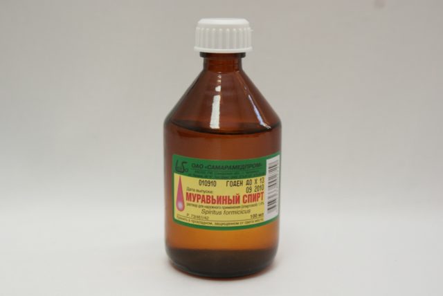 Мравчена киселина е ефективна срещу кръвосмучещи насекоми - комари, мушици и кърлежи. Преди да влезете в гората, се препоръчва да се търкат откритите области на тялото с разредено фармацевтично вещество. Употребата на алкохолен разтвор на мравчена киселина е показана за вече съществуващи ухапвания. Те могат да бъдат лекувани с средство за сърбеж и дразнене.