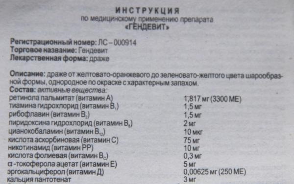 Инструкциите за употреба на витамините Gendevit показват, че хранителната добавка се състои от следните вещества: