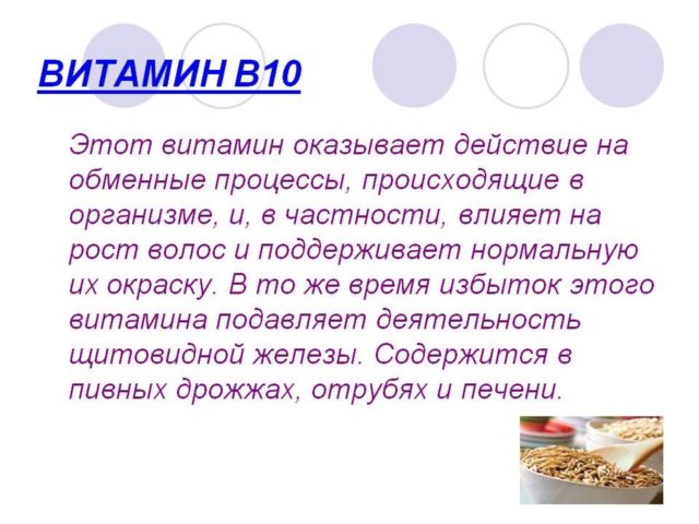 Витамин В10 е един от микроелементите, необходими за човешкото тяло. Това съединение е необходимо за нормалното усвояване на фолиевата киселина. Можете да предотвратите развитието на дефицит, ако се храните правилно и включите в диетата храни, съдържащи пара-аминобензоена киселина - под формата на пилешки яйца, черен дроб и други странични продукти, както и мая. Ако симптомите на недостиг на витамини са силно изразени, тогава трябва да се консултирате с лекар, който ще предпише специални средства.