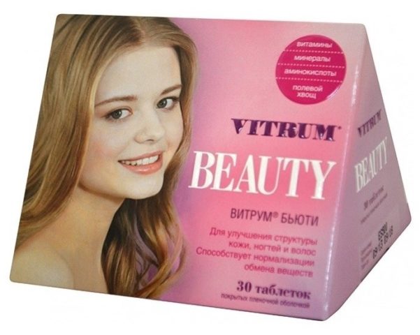 - Vitrum Beauty... Комплексът е предназначен за жени. Съдържа 10 mg витамин B10. Нормализира метаболитните процеси, подобрява състоянието на косата, ноктите и кожата. Противопоказан при бременни и кърмещи жени, както и деца под 18-годишна възраст. Дневната доза е 2-3 таблетки. Курсът продължава най-малко 1 месец.