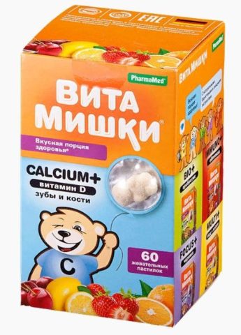 - Витамишки калций +. Подсладените гуми са с форма на мечки с различни вкусове. Продуктът съдържа не само калций и витамин D3, но и фосфор. Добавката може да се използва от деца на възраст от 3 години.