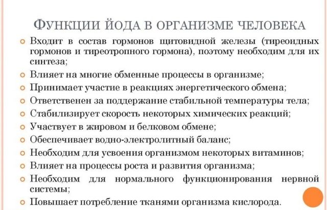 Йодът е един от важните елементи на човешкото тяло. Този компонент е отговорен за функционирането на щитовидната жлеза и нивото на хормоните. Той участва пряко в метаболитните процеси.