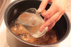 - След това зърнените храни се заливат с 3 чаши вода, слагат се на котлона и се добавя топлина до висока степен.