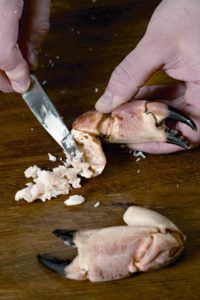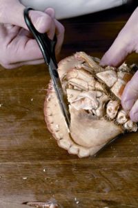 Ноктите и краката на животното се разделят с дръжката на тежък нож, клещи или точилка и месото се отстранява от тях.