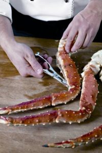 Ако трябва да изрежете голям вид (Камчатка, например), ще трябва да използвате кухненска ножица или резачка. На всеки крак се прави надлъжен разрез и всяка фаланга се изрязва отделно.За да направите това, по-добре е да разделите фалангите, като ги завъртите в различни посоки.