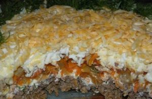 - Те започват да излагат слоевете: първият - ситно нарязани стомаси, вторият - нарязан на кубчета лук, който се намазва със слой майонеза; третият - яйца, натрошени в резачка за яйца; четвъртата е морковите, нарязани на малки кубчета.