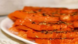 Рецептата за печена тиква при захарен диабет може да се използва само от страдащите от първия вид болест: тиквата, нарязана на филийки, се пече във фурната на фолио или пергамент. Няколко минути преди готвене продуктът може да се намаже с малко количество разтопено масло.