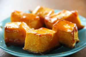 - Нарежете тиквата на ситно и оваляйте в меден сос.