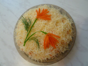 - Обелете морковите, разтрийте върху специален шредер, за да получите дълга мека сламка, която се изсипва в чаша.
