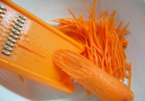 - Обелете морковите, настържете ги с шредер, за да направите дълга гъвкава сламка.