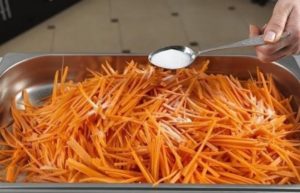 - Добавете пипер, захар към морковите, разбъркайте и оставете настрана.