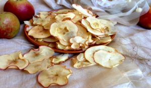 Ябълките се нарязват тънко, варят се в захарен сироп за 5 минути, изпращат се в микровълновата за 7 минути, докато станат хрупкави. Ползата от тази закуска е, че можете да я използвате като закуска между храненията.