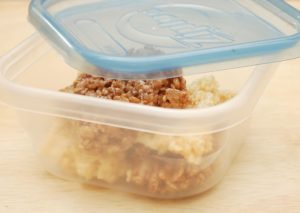 - Формата за печене е покрита със стреч фолио, върху нея се разстила ориз, равномерно разпределен по форма и всичко е напълно увито в пластмаса.