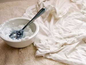 Umedece-se uma mancha de roupa com uma nódoa com água fria, aplica-se uma massa fria e limpa-se com uma escova macia em movimentos circulares. Depois disso, o item é imediatamente enxaguado em água morna. Você pode corrigir o resultado adicionando 50 ml de amônia à água de lavagem. Em seguida, as roupas devem ser lavadas novamente, desta vez com o sabão em pó usual para branco.