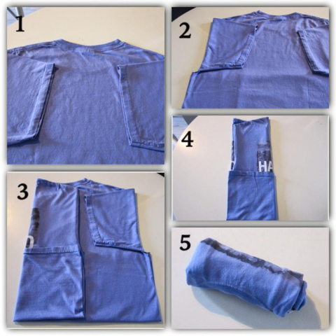 Esta opção é adequada para pessoas que viajam com frequência. Se você usar este método, a camiseta não amargará e não ocupará muito espaço na mala. Uma superfície firme e nivelada é necessária para o procedimento correto.