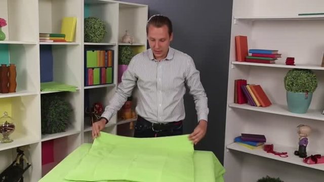 A superfície de trabalho deve ser firme para que o tecido não enrugue - Coloque o lençol por cima da capa de edredão, previamente dobrado seis vezes. Espalhe com as mãos para que não enrugue no processo.